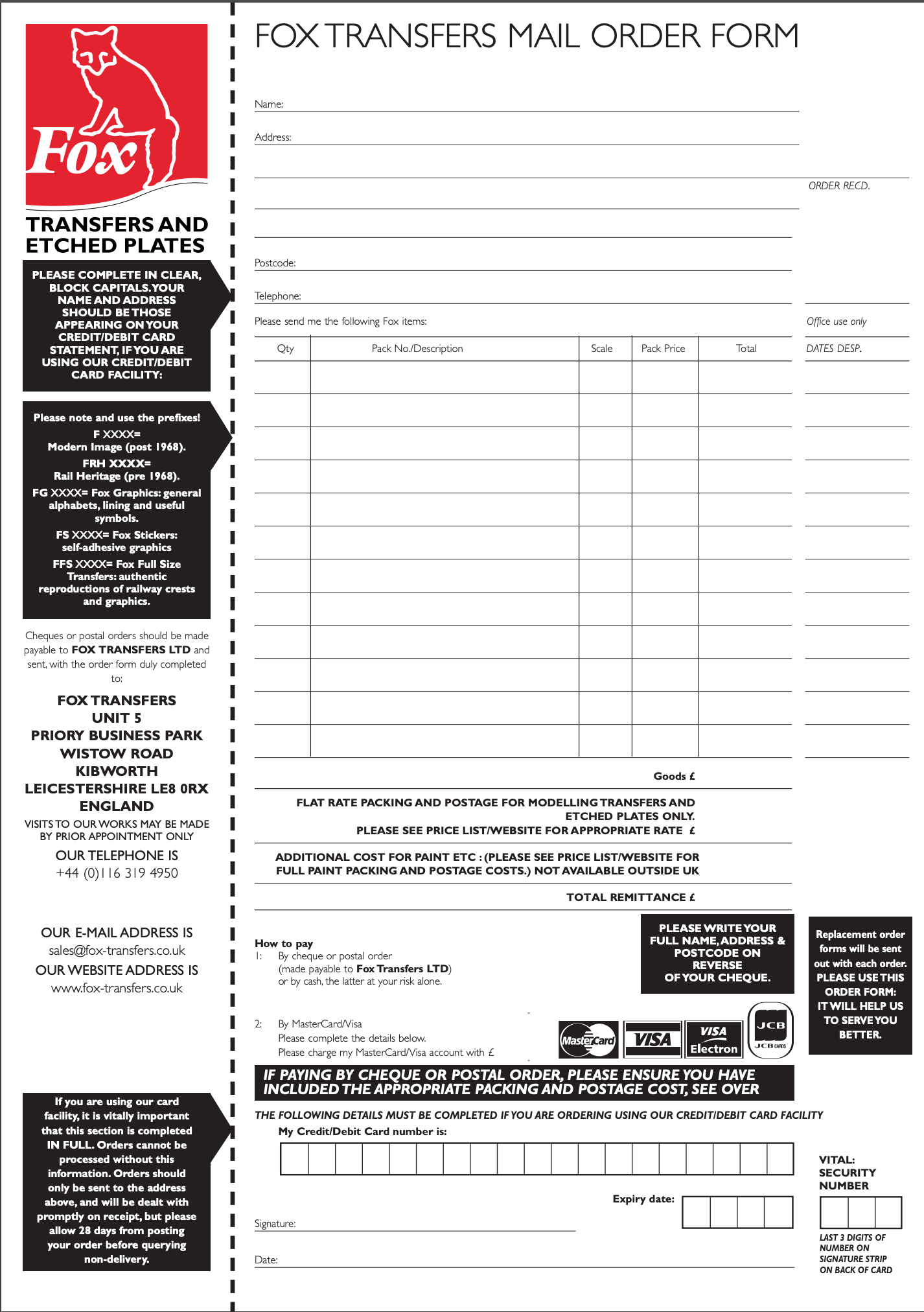 If you would prefer not to order via our secure online facility we are happy to accept orders by alternative means. Print off the order form to use for your convenience. Mail to us at Fox Transfers with your choice of payment method and we will process your order by return (as per our terms and conditions). You can also fill out the order form for easy reference if you want to telephone us with your requirements.